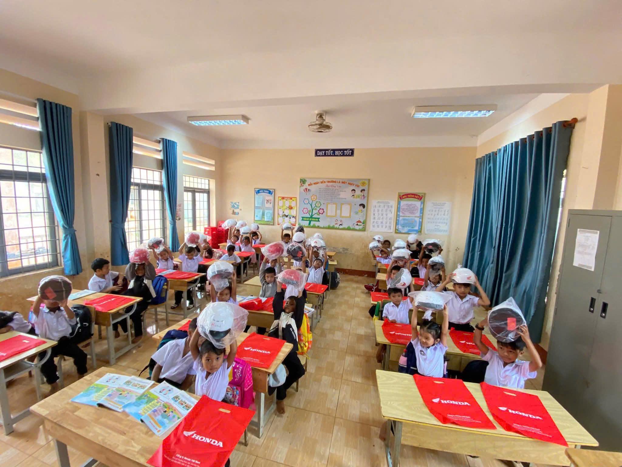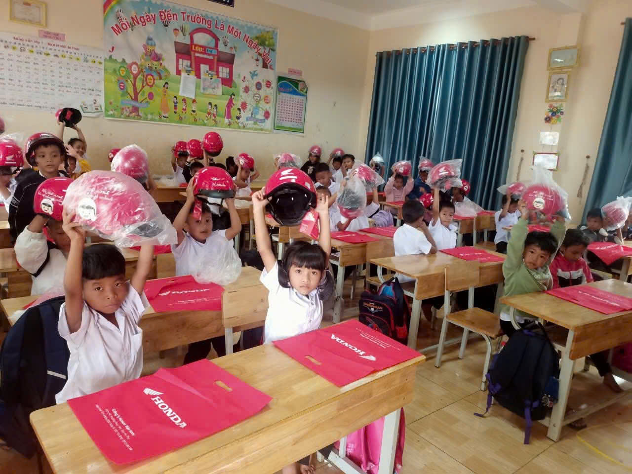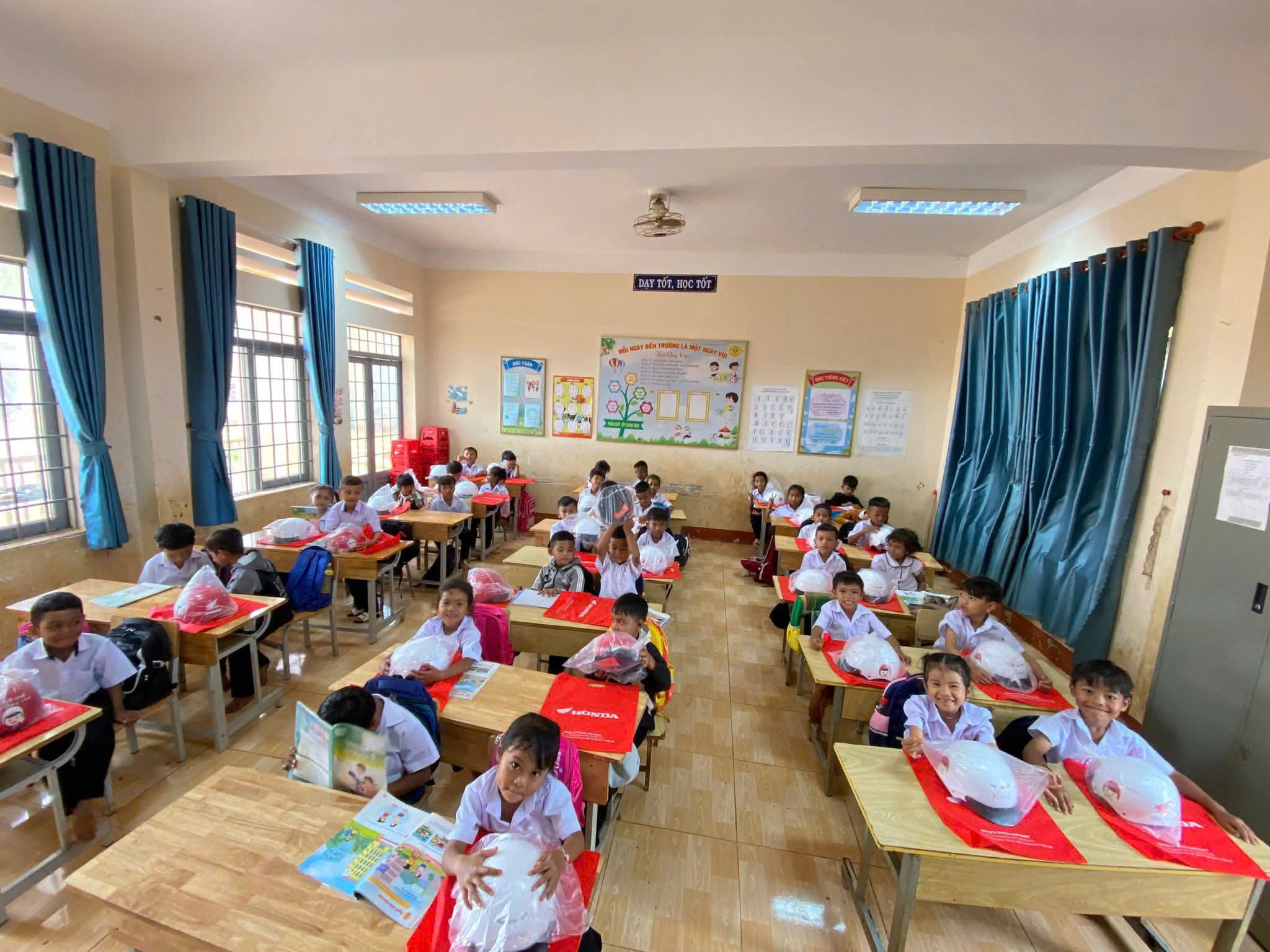 Đội mũ xinh, bảo vệ chúng mình. ❤️❤️❤️ Các bạn học sinh lớp 1 trường Tiểu học Y Jut rất hào hứng khi được nhận mũ bảo hiểm từ công ty Hon da.